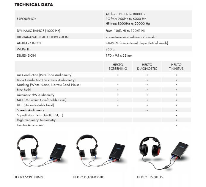 The HEKTO Diagnostic model includes bone conduction evaluation of a limited range of pure tones, cognitive tests, and has internal memory for speech materials, customizable word lists, and pediatric applications. This model is suitable for more comprehensive audiological assessments.